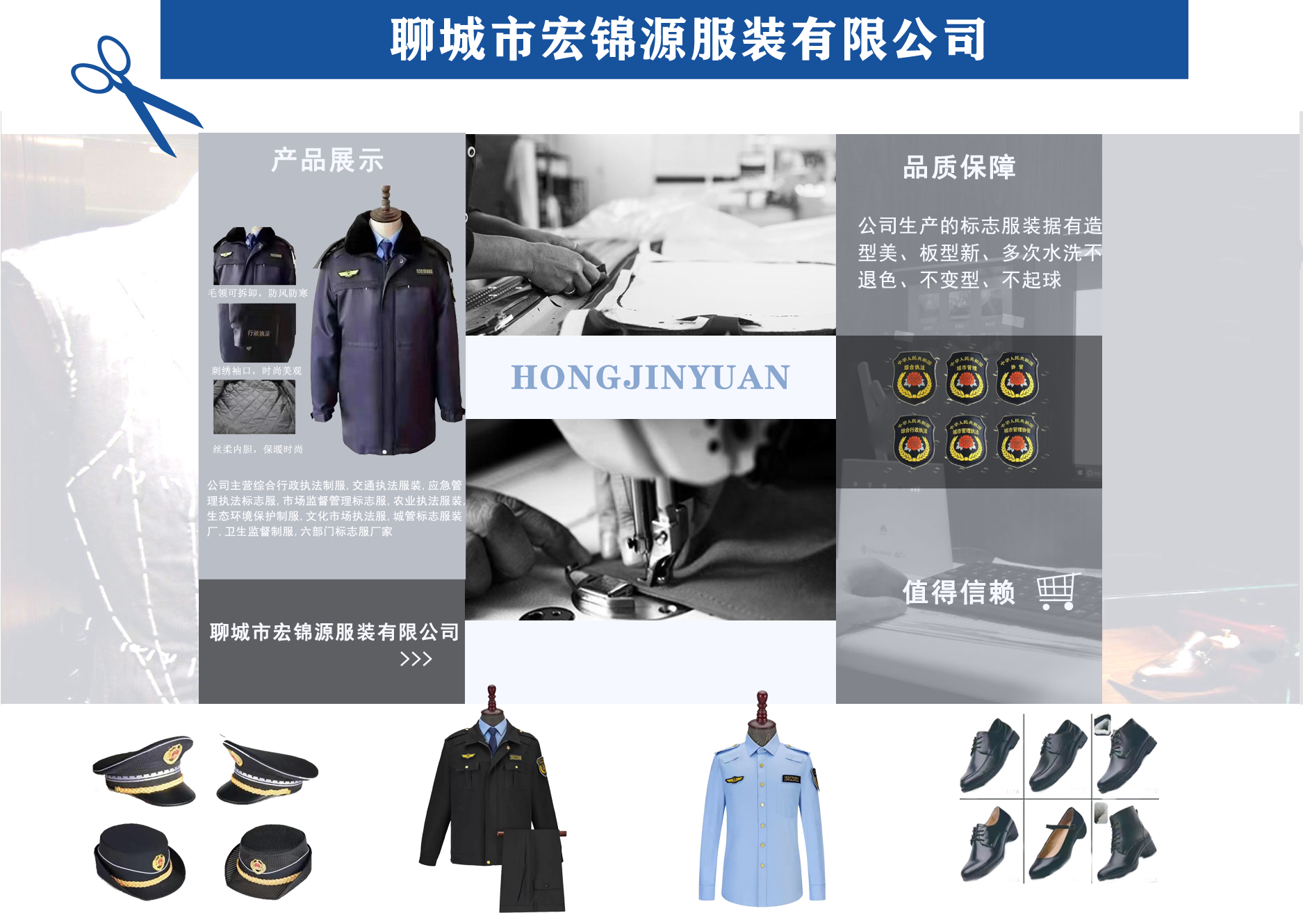 聊城市宏錦源服裝有限公司位于江北水城—山東聊城,地理位置優越,交通便利。公司主營綜合行政執法制服,交通執法服裝,應急管理執法標志服,市場監督管理標志服,農業執法服裝,生態環境保護制服,文化市場執法服,城管標志服裝廠,衛生監督制服,六部門標志服廠家等,值得信賴! 公司生產的標志服裝據有造型美、板型新、多次水洗不退色、不變型、不起泡?! 罢J真辦事,踏實做人”是宏錦源的企業精神,我們的宗旨是:“用服務與真誠來換取你的信任與支持,互惠互利,共創雙贏!”我公司愿與國內外各界同仁志士竭誠合作,共創未來企業目標:在已選定的服飾領域中,成為行業的卓越者。 經營理念:追求產品卓越,為用戶提供完美、高效的服務。...